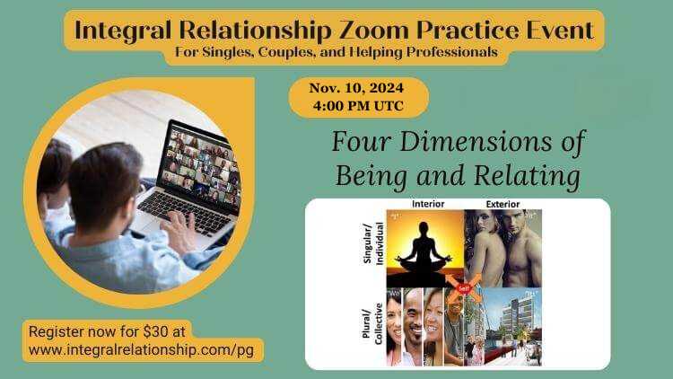 Register to learn and practice building a solid foundation for a healthy, sustainable, Integral Love Relationship. Realize that four essential dimensions of your human being and relating come into intimate contact when you fall in love and enter a committed romantic relationship, regardless of whether or not you and your partner are consciously aware of them. See how these four dimensions are arranged in four quadrants: