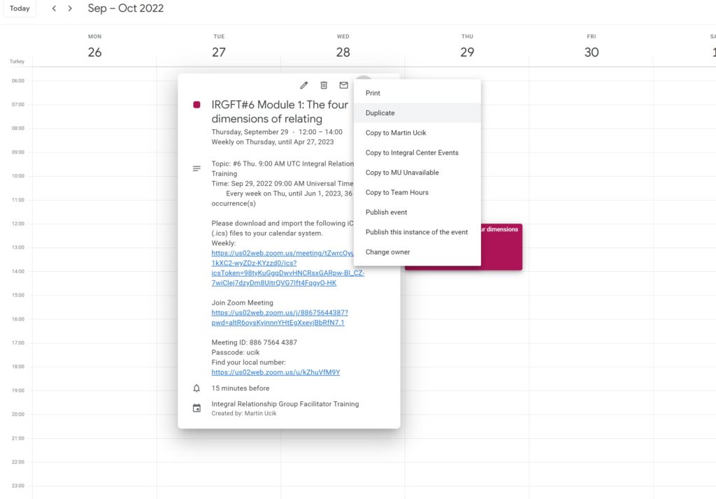 Then you can unselect/disable the “Integral Relationship Group Facilitator Training” calendar under “Other calendars” in the left panel and the entire “Integral Relationship Group Facilitator Training” calendar will disappear (until you select it again) and you will only see the events that you copied to your personal calendar.